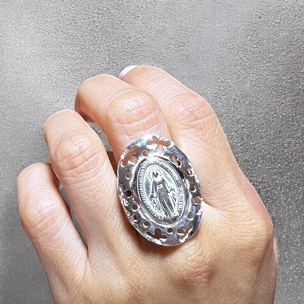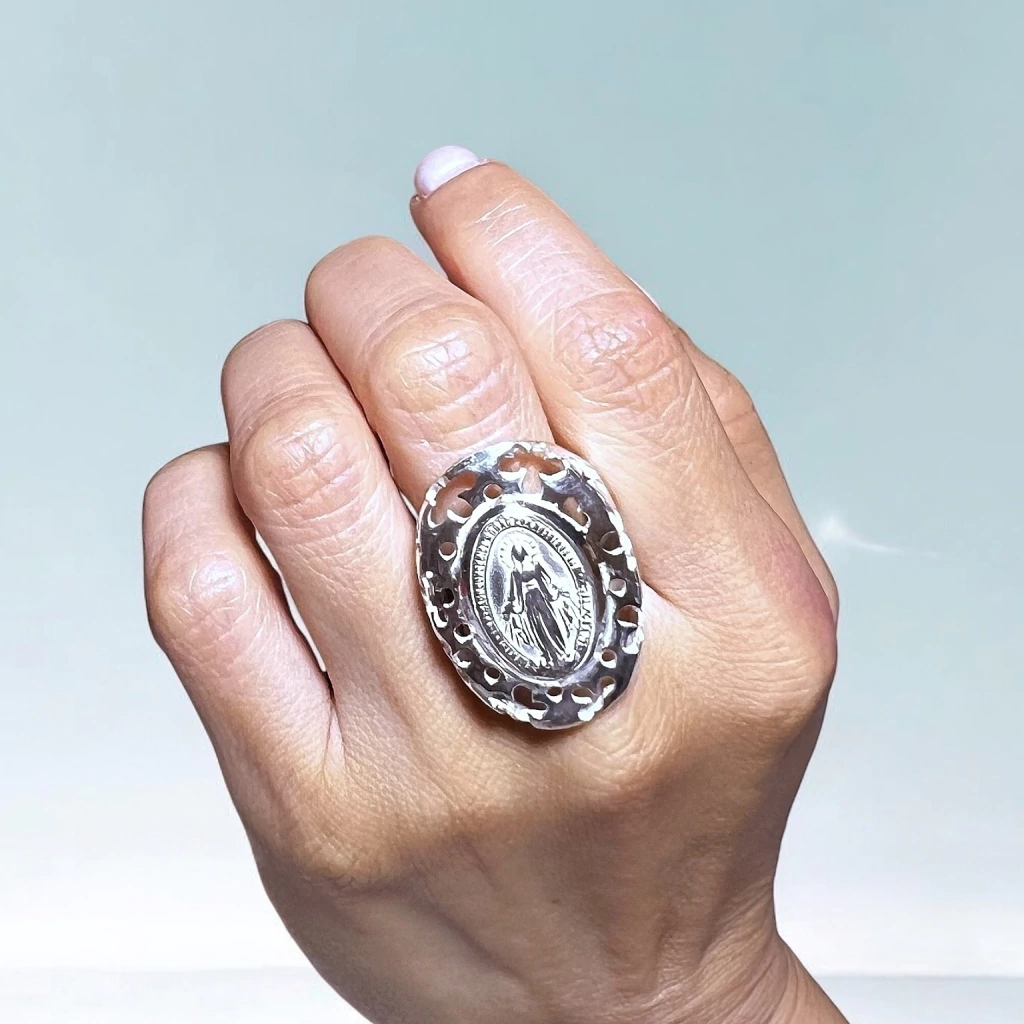 ¡Descubrí nuestro Anillo Medalla Milagrosa, una joya que combina espiritualidad y elegancia! Este hermoso diseño en plata 925 presenta una delicada medalla con flores caladas, simbolizando protección y belleza.