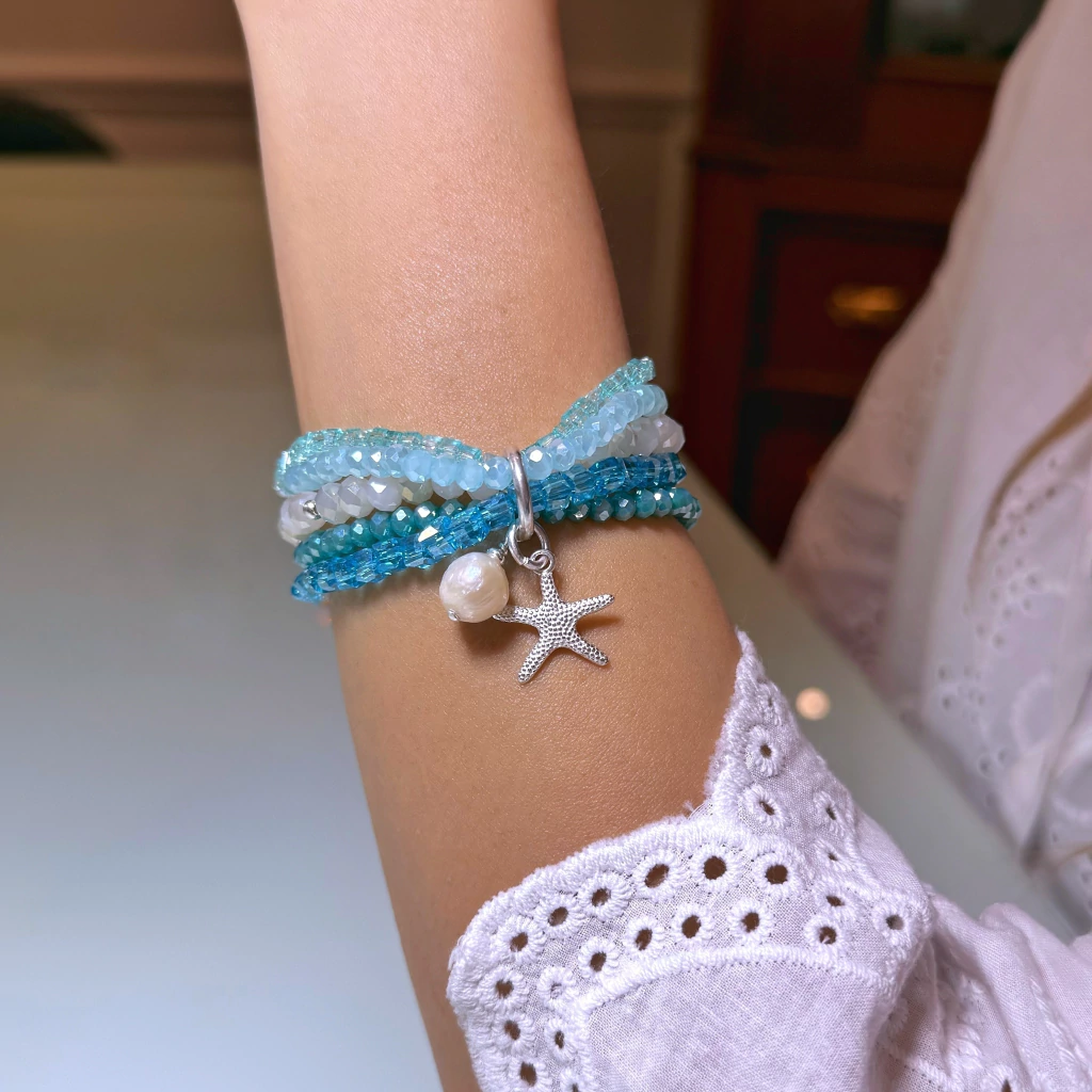 ¡Descubrí la Colección Naturaleza Pulsera del Mar, inspirada en los colores del océano! Este set incluye 5 pulseras elásticas confeccionadas con cristales checos de primera calidad, adornadas con perlas de río y una delicada estrella de mar en plata 925.