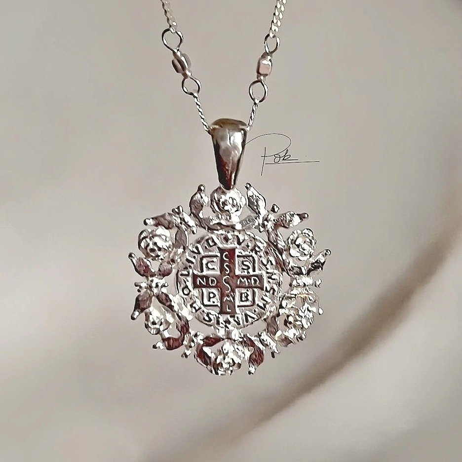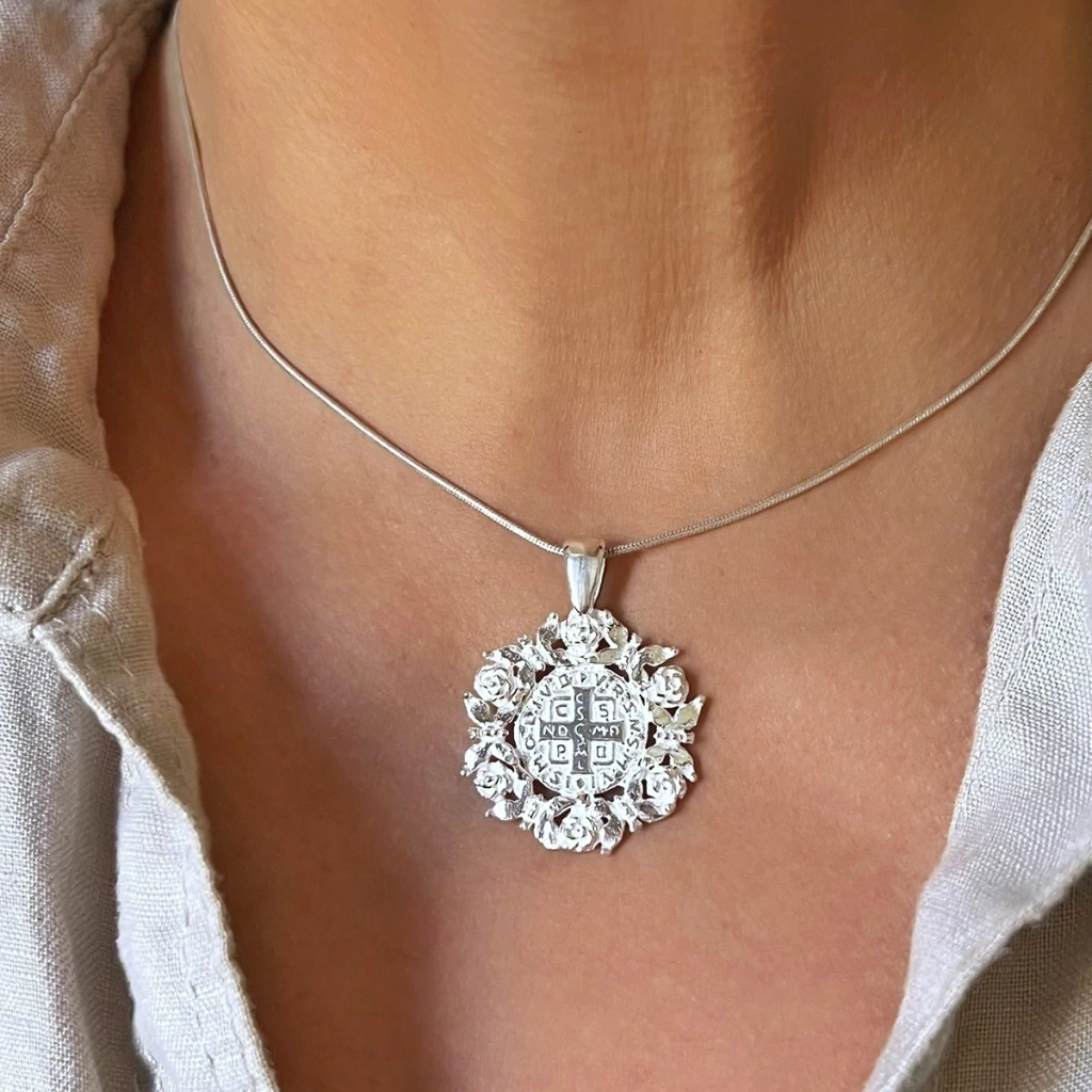 Descubrí el Dije San Benito línea floral, una joya de plata 925 trabajada artesanalmente que combina tradición y delicadeza. Su diseño floral detallado aporta un toque de elegancia y protección a tu estilo diario. Perfecto para llevar solo o acompañado, este dije es un símbolo de fe y belleza.