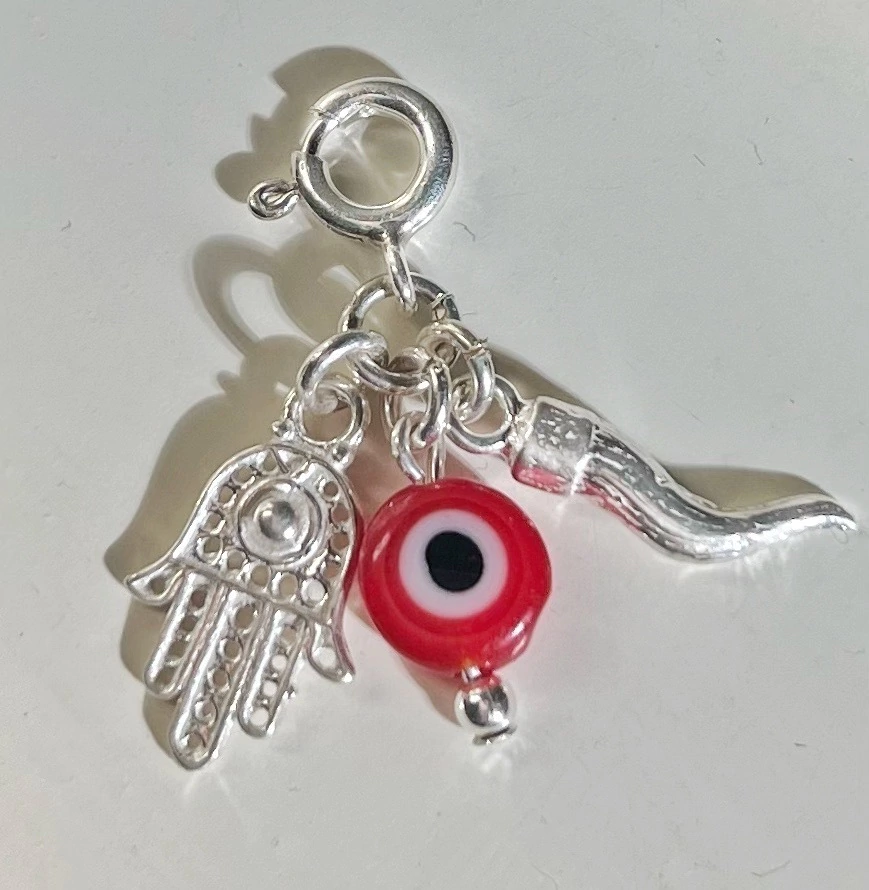 ¡Descubrí nuestro Mini Manojito protector de plata 925! Este encantador accesorio, que incluye un ojito rojo, cuernito y mano de Fátima, mide 2cm y es perfecto para llevar en pulsera o cadena. Su diseño delicado no solo aporta un toque de elegancia, sino que también simboliza protección y buena energía.